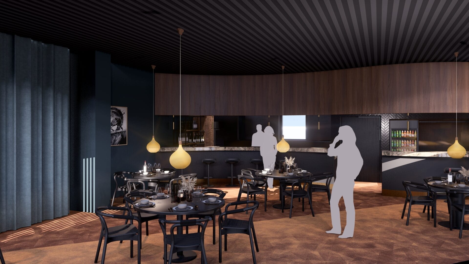Bakom logerna öppnar loungedelen upp sig – en social och flexibel yta med plats för cirka 30–40 personer. Här skapas en naturlig samlingspunkt för mingel, samtal och gemensamma upplevelser i en avslappnad men exklusiv miljö.